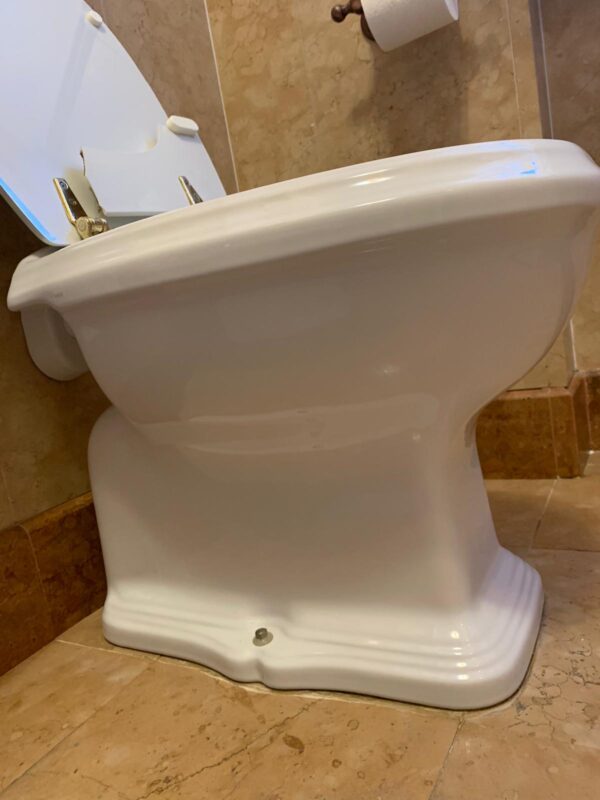 Uno degli elementi più caratteristici è il piede lavorato, con profilature e modanature nella parte inferiore che richiamano uno stile classico inglese. La base non è liscia: presenta curve e rilievi decorativi che rendono il sanitario facilmente riconoscibile anche lateralmente. Per questo WC è necessario utilizzare il copriwater specifico dedicato.