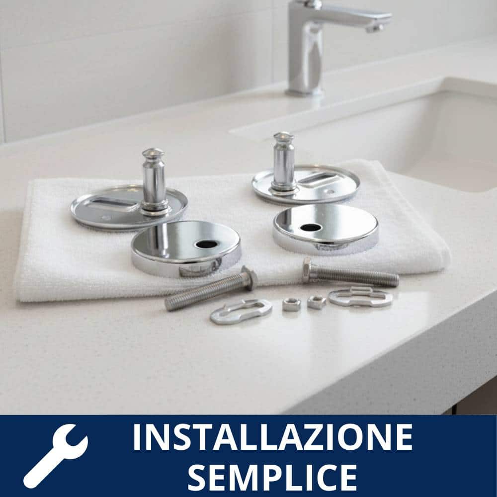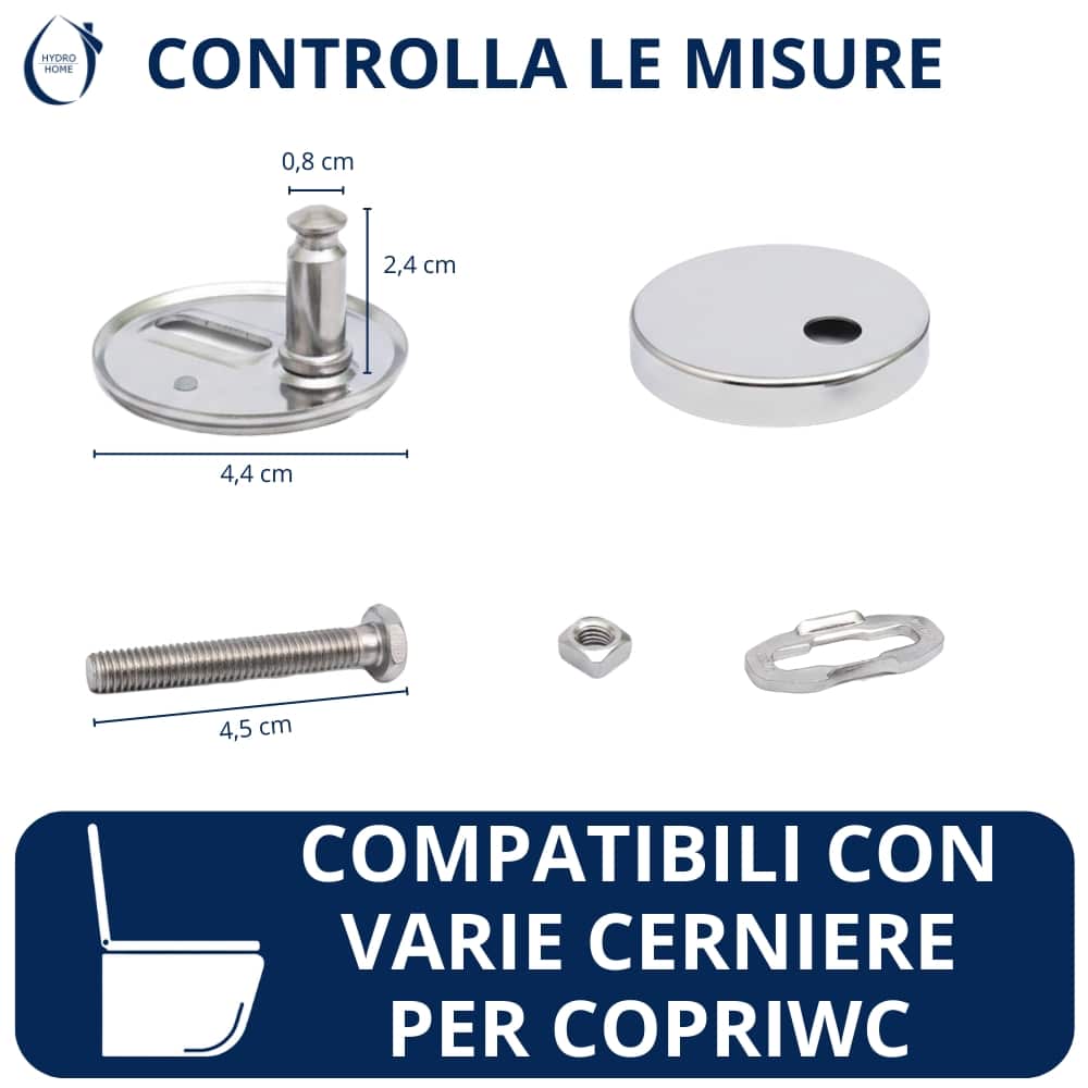 Con questo kit puoi sostituire i componenti persi e ripristinare il corretto fissaggio delle cerniere, evitando di cambiare l’intero copriwater.