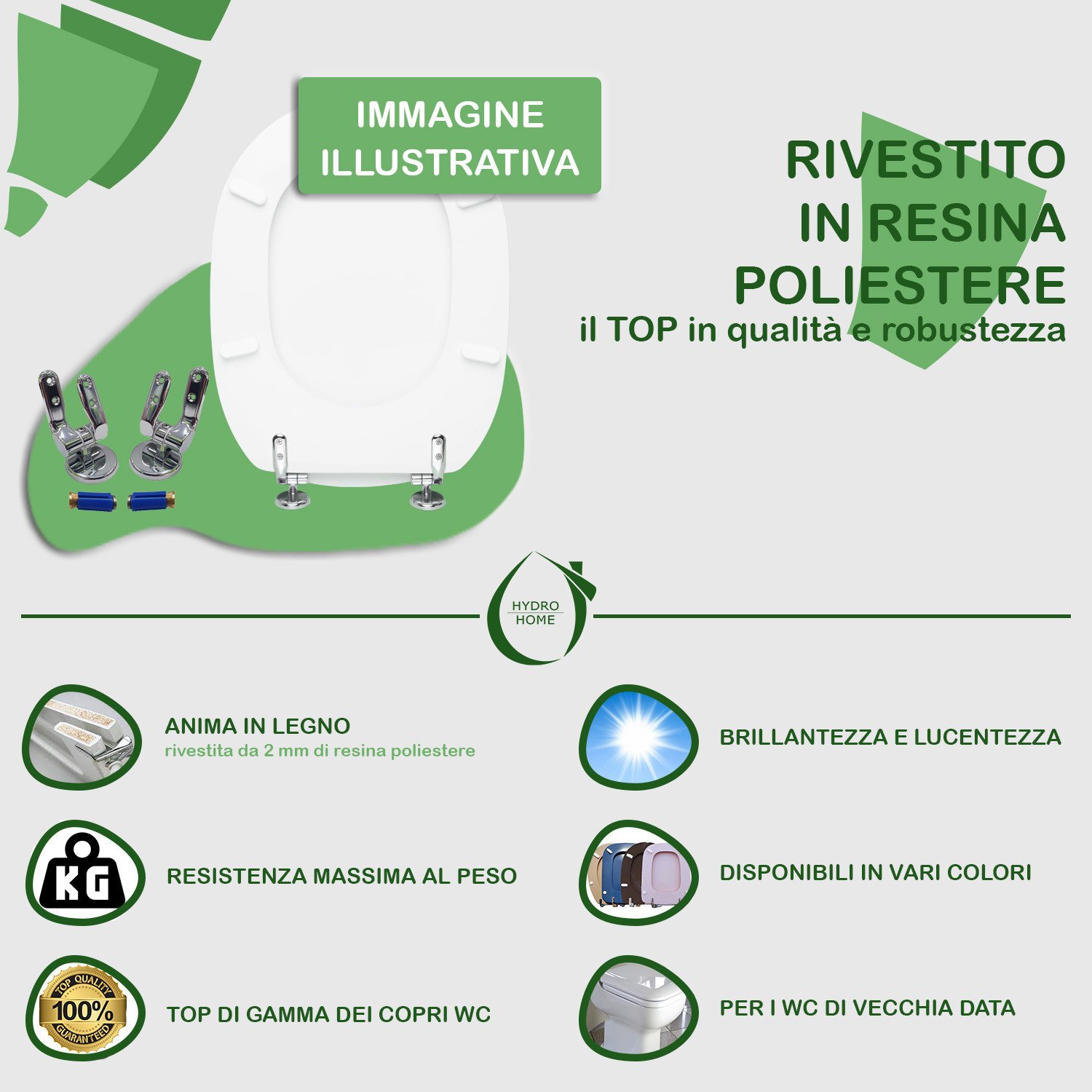 LEGNO RIVESTITO IN RESINA POLIESTERE (TOP QUALITY): O “COLATI” sono il top di gamma per quanto riguarda i sedili di legno o similari. Sono composti da un anima in legno truciolare ricoperta da 2 mm di resina poliestere che rendono il copriwater robusto ed esteticamente migliore rispetto ad un verniciato.
