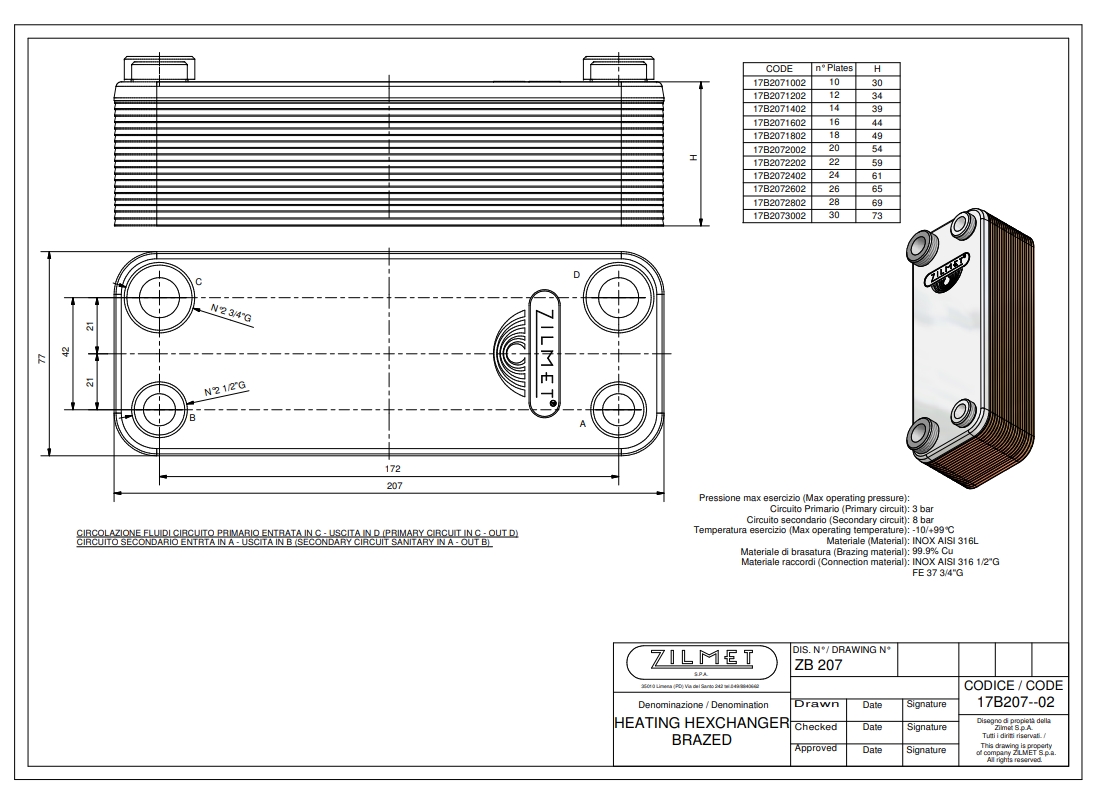 Scambiatore a 14 piastre senza raccordi – Attacchi 3/4” e 1/2” per Vaillant VCW, Sarigas e Pensotti – Materiale INOX AISI 316L, temperatura d’esercizio -10/+99°C