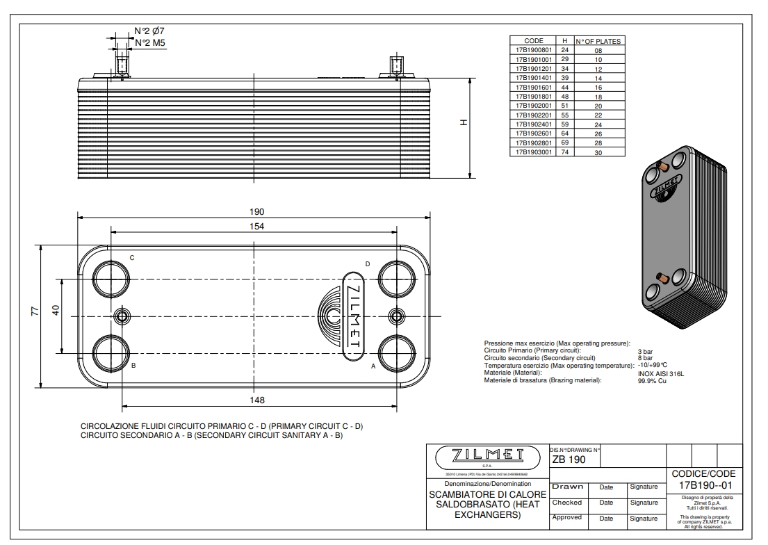 Scambiatore OR.12 piastre Beretta 20K – Attacchi ad innesto, interasse 148 mm, lunghezza 190 mm