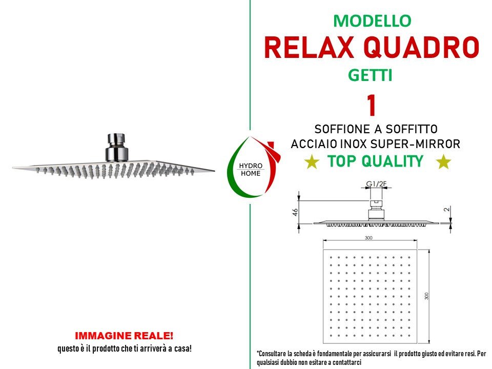 Soffione Relax Quadro in acciaio inox super-mirror 300x300x2 mm anticalcare, a soffitto monogetto.