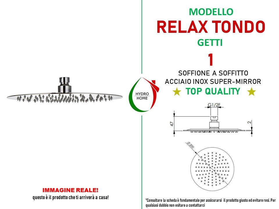Soffione Relax Tondo in acciaio inox super-mirror Ø200×2 mm anticalcare, a soffitto monogetto.